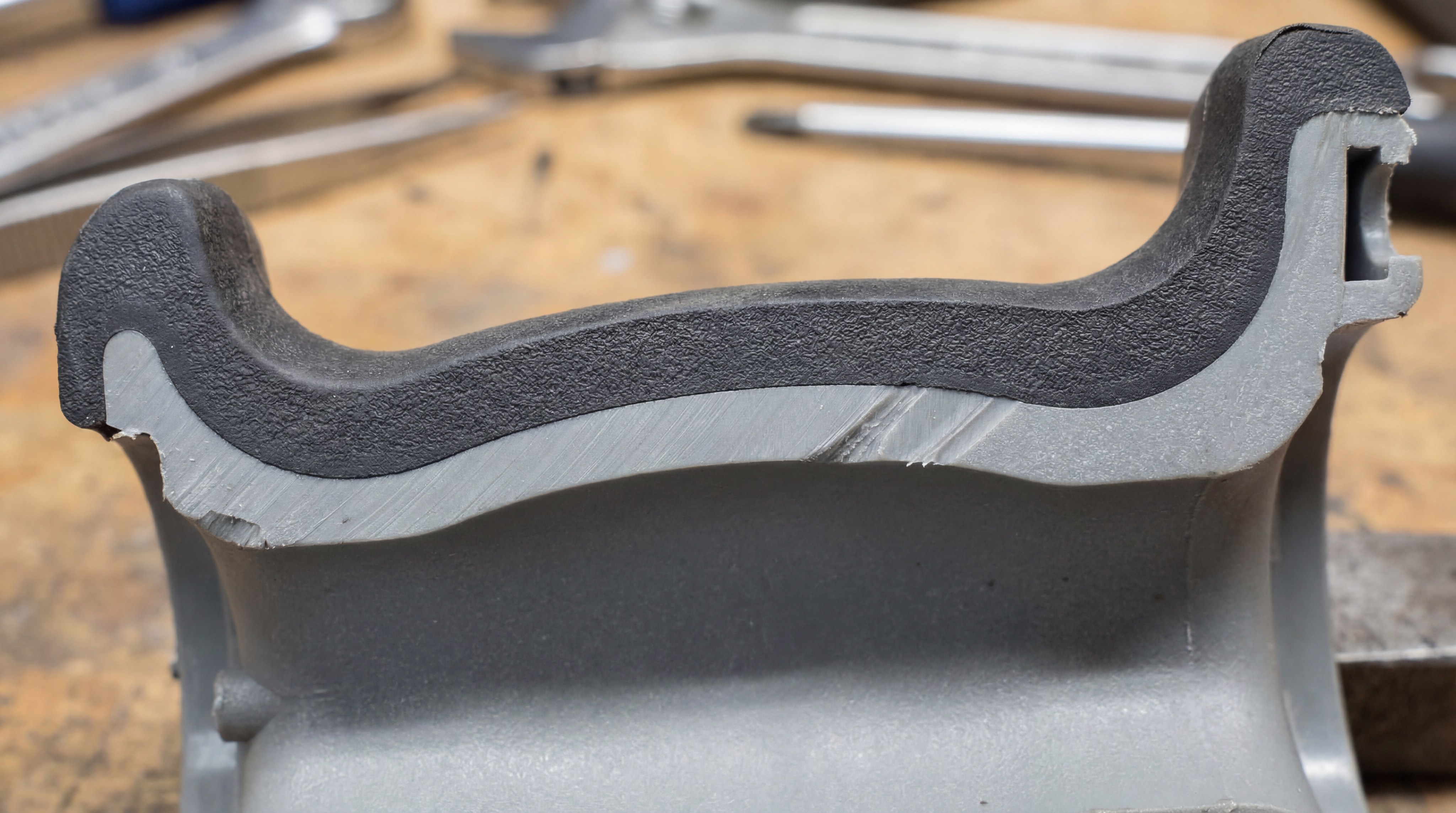 But wait: If you need a soft grip on a metal handle, the process actually involves two steps: first molding a plastic sleeve onto the metal (insert molding), and then overmolding the elastomer onto that sleeve.