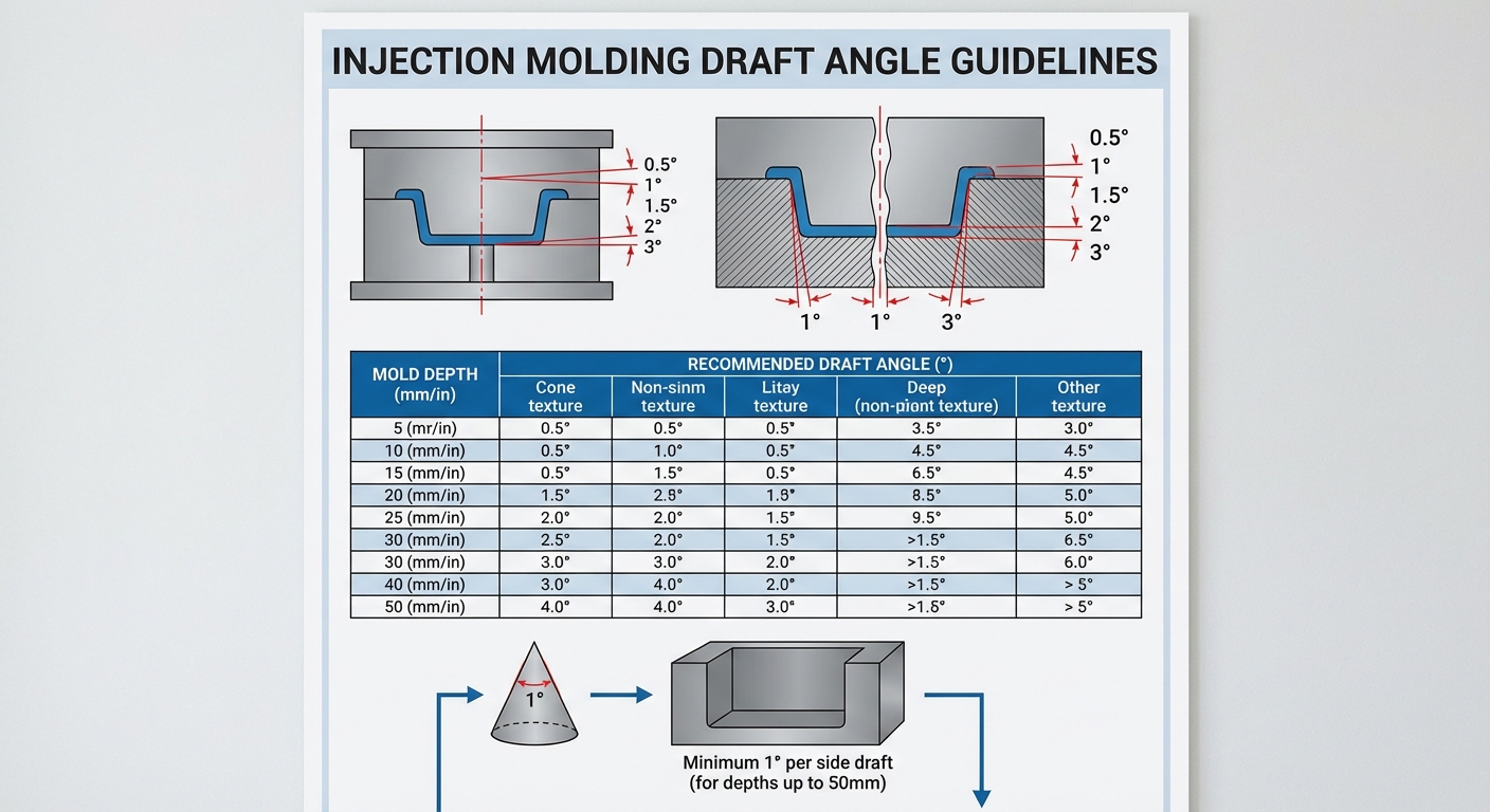 Most professional molders recommend a minimum of 0.5 degrees on all vertical faces to provide basic clearance. However, increasing this to 1 or 2 degrees is often safer for standard materials like ABS or Polypropylene.