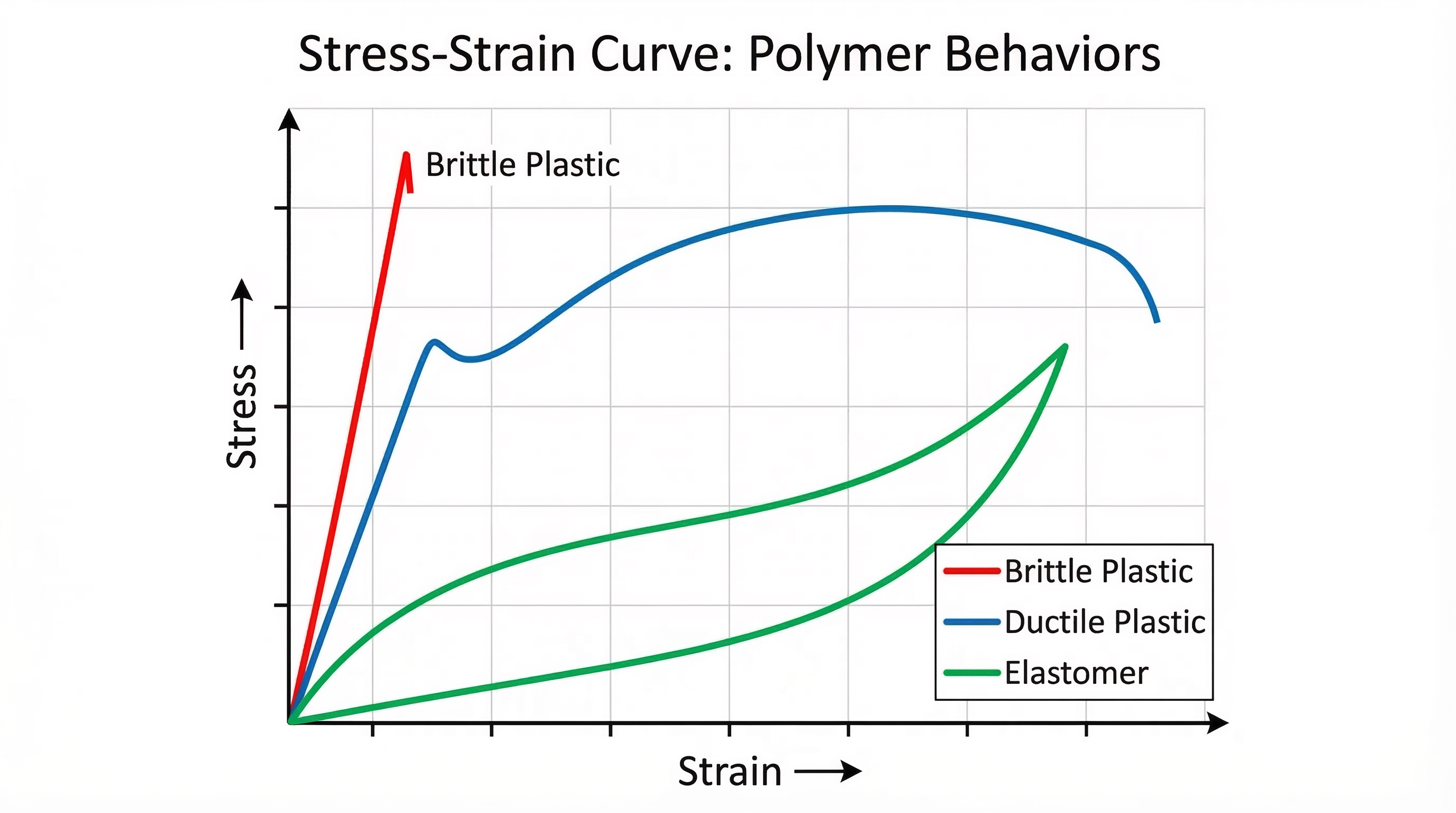 | Property | Brittle Plastic | Ductile Plastic | Elastomer | |
